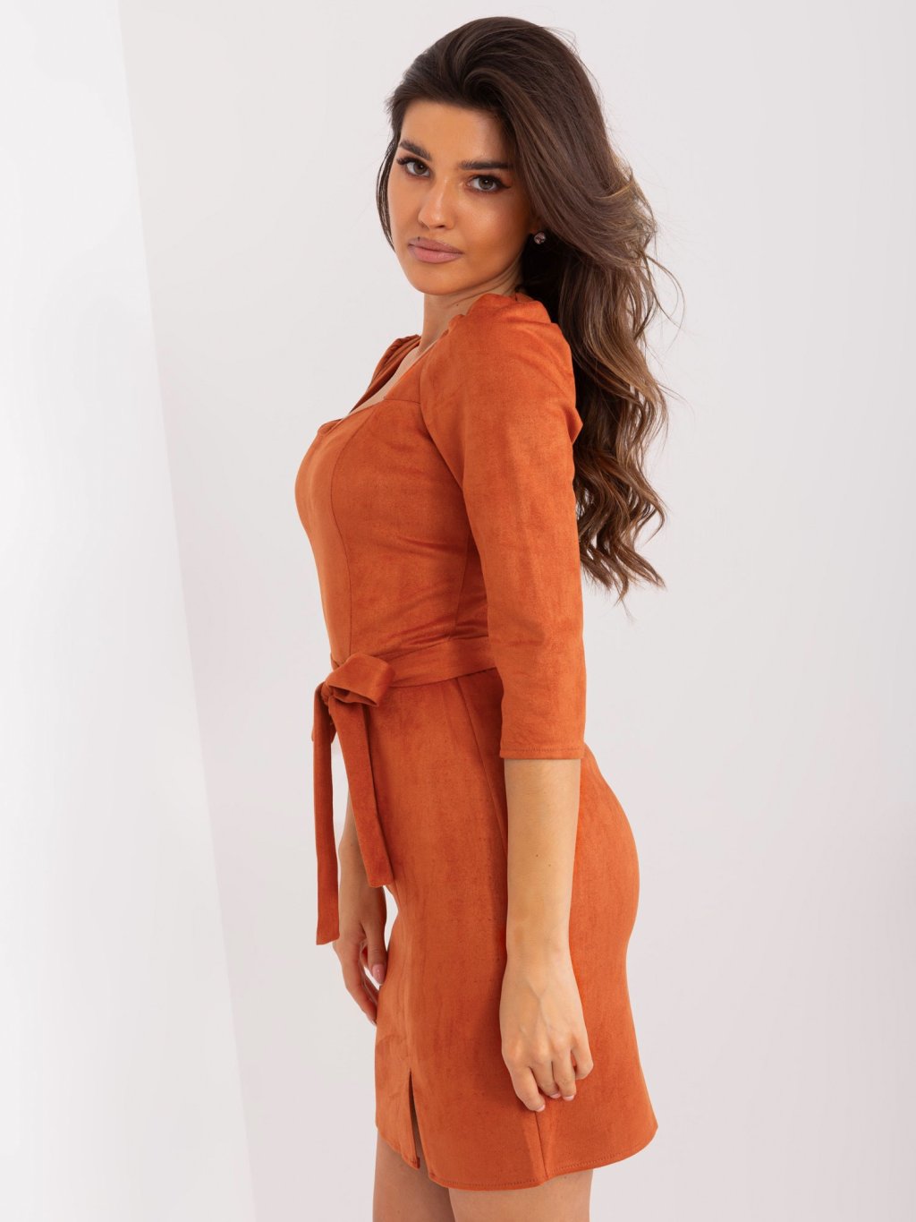 TMAVĚ ORANŽOVÉ VYPASOVANÉ MINI ŠATY S PÁSKEM