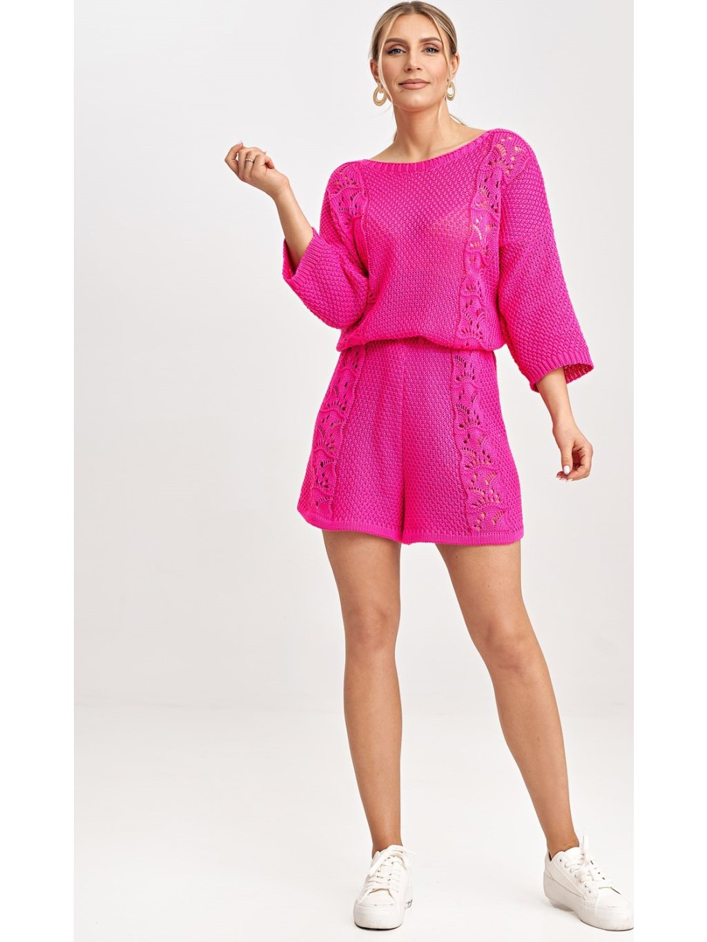 TMAVĚ RŮŽOVÁ DÁMSKÁ PLETENÁ SOUPRAVA HALENKY S 3/4 RUKÁVEM A KRAŤASŮ