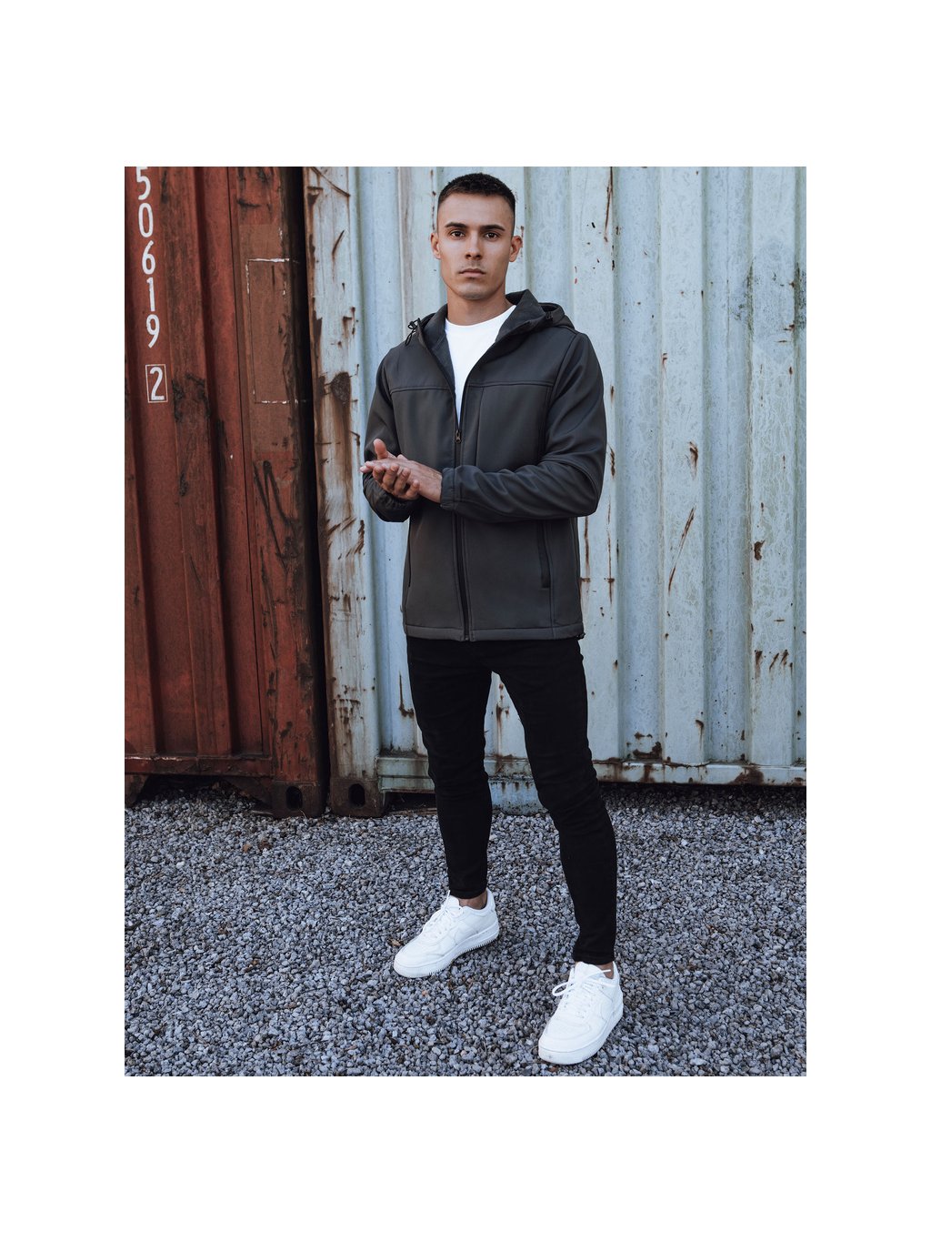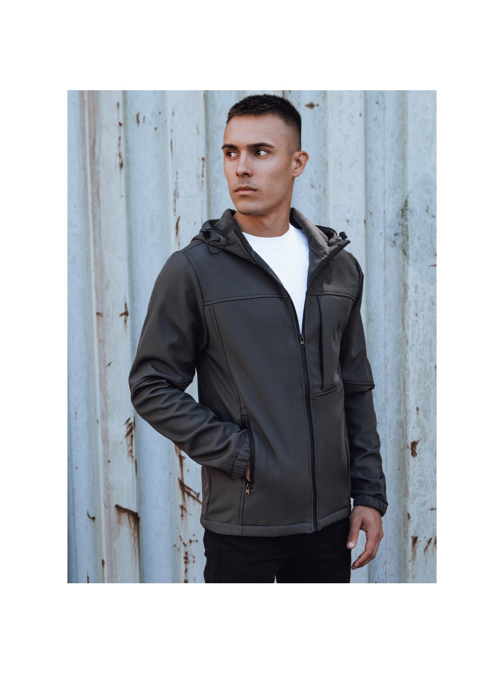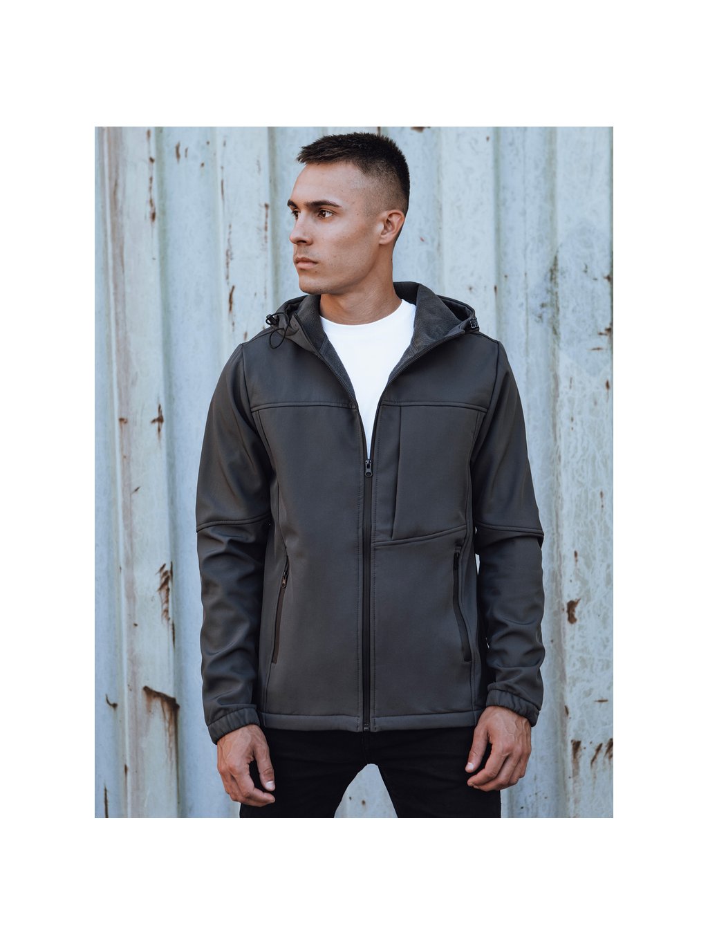 TMAVĚ ŠEDÁ PÁNSKÁ SOFTSHELLOVÁ BUNDA S KAPUCÍ