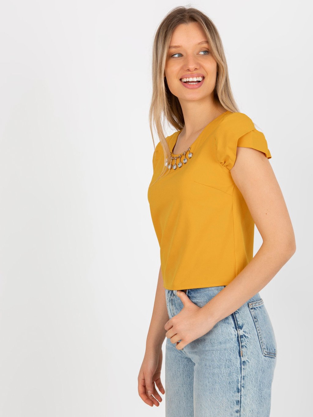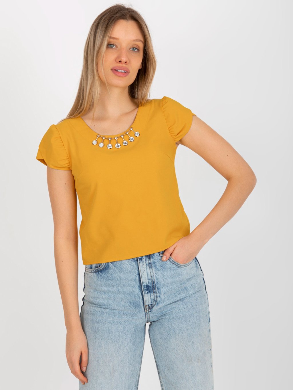 TMAVĚ ŽLUTÁ HALENKA SE ZLATOU APLIKACÍ A KRÁTKÝM RUKÁVEM