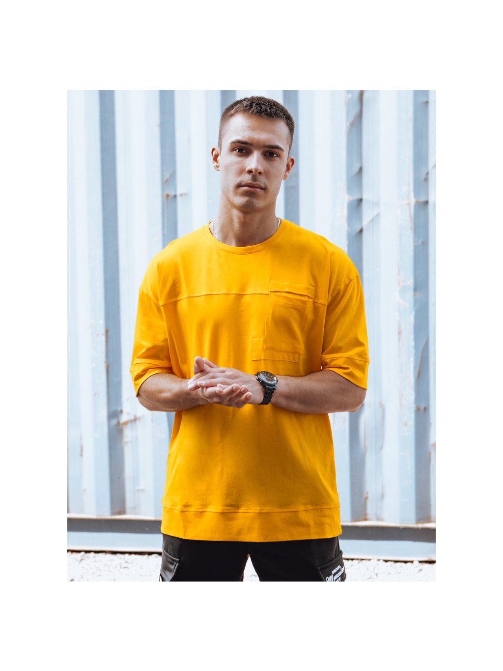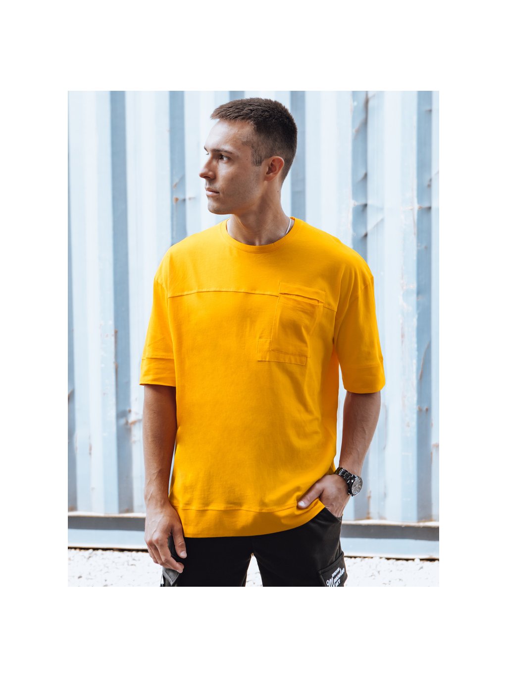 TMAVĚ ŽLUTÉ PÁNSKÉ TRIČKO S NÁPRSNÍ KAPSOU