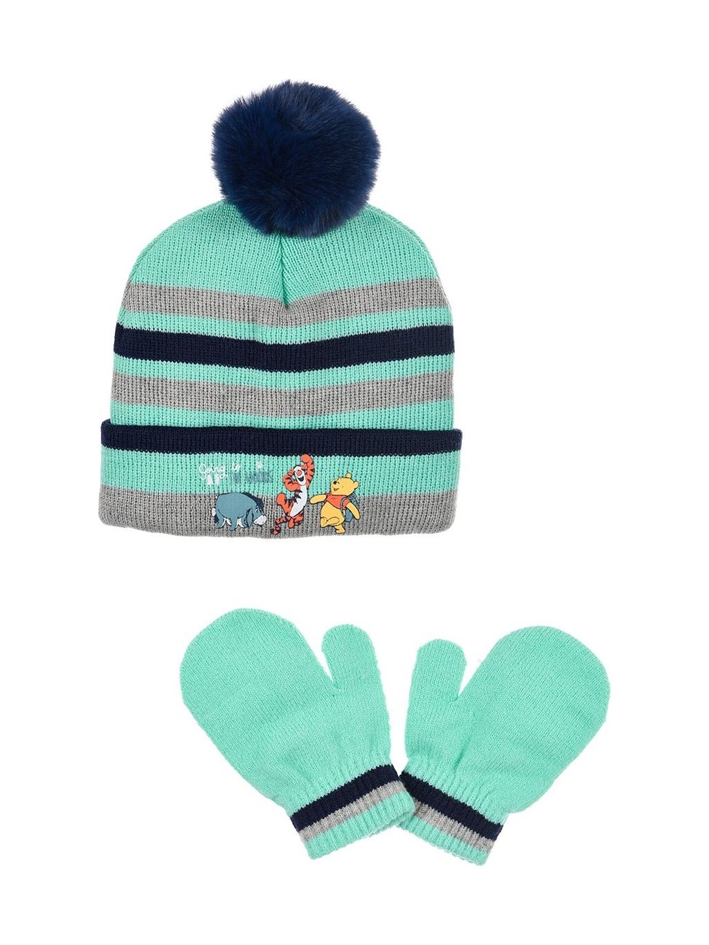 WINNIE THE POOH MINTOVO-ŠEDÁ PRUHOVANÁ ČEPICE S RUKAVICEMI